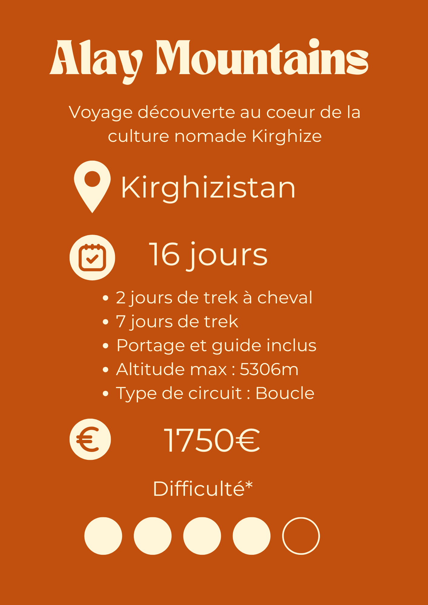 Nous travaillons en collaboration avec Visit Alay, une agence outdoor et bureau de CBT (Community Based Tourism) qui travaille exclusivement avec des des acteurs locaux et communautés. Le but de Visit Alay est de promouvoir un tourisme plus éthique et authentique en partagent équitablement les revenus avec les familles qui désirent contribuer à l’hébergement de voyageurs.